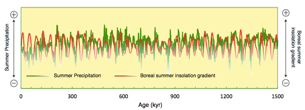 水循环的变化对于干旱地区(如黄土高原)的生态环境有巨大的影响,因而定量预测未来降水可能的变化是全球变化研究的重点。由于缺乏成因明确的古降水指标,过去几个百万年以来黄土高原降水量变化的驱动因子还存在争论。表生地球化学教育部重点实验室李高军和李涛等人在前期工作的基础上(http://www.sciencedirect.com/science/article/pii/S0012821X13005748)利用黄土中生物微钙体的Sr/Ca比值定量重建了过去1.5个百万年以来黄土高原夏季降水量的变化(如下图)。结果表明,相比于以往认为的冰量(ice volume)和夏季太阳辐射(summer insolation)的变化主导了轨道时间尺度上东亚夏季风降水的强弱更替,地球轨道斜度(tilt of Earth)的变化显得更加重要。结合气候模式结果,研究者认为这是由于东亚地区特殊的海陆分布格局所导致的:与其他季风区相比,东亚季风区的陆地主要分布在中高纬地区,而作为水汽源区的海洋则处于低纬,地球轨道斜度变化通过控制北半球夏季中高纬和低纬之间的太阳辐射差异(boreal summer insolation gradient),进而主导了东亚地区海陆热力差异和夏季降水量的变化。由于目前地球轨道斜度正处于持续降低的中间阶段,未来东亚地区夏季降水量有可能会进一步减少,黄土高原的生态环境可能进一步恶化。