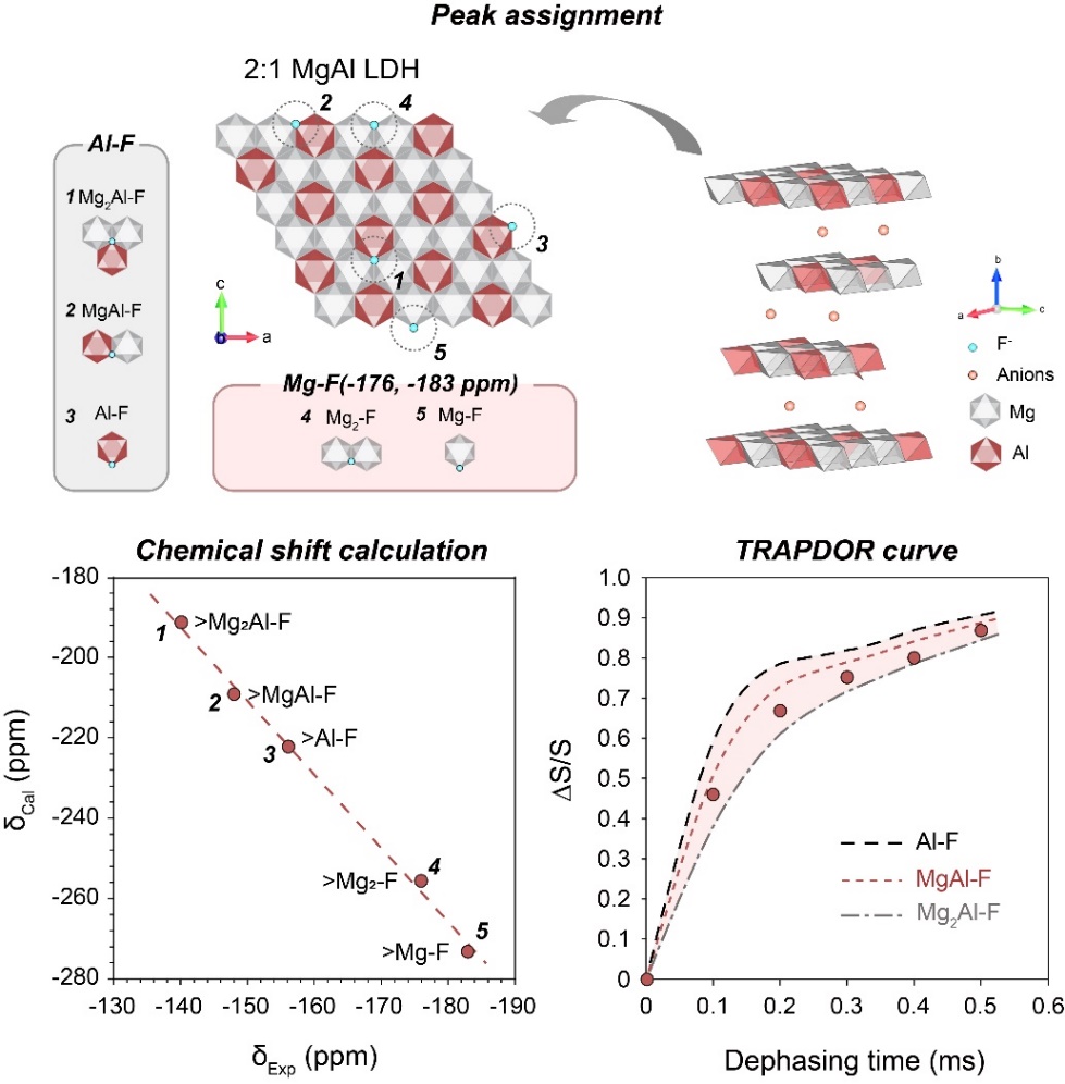 矿物的表面位点是理解矿物反应活性的基础,也是预测地质条件下矿物-流体的地球化学化学行为的关键。然而,目前对矿物表面的位点的认识和理解主要基于晶体化学结构和理论化学计算来间接获取,传统实验技术还无法准确表征其表面位点。李伟教授团队选择层状的镁铝水滑石(MgAl LDH)为研究对象,利用F离子作为原子探针,通过19F固体核磁共振波谱学和量子化学计算相结合成功地从原子尺度表征镁铝水滑石的{001}表面所有可能基团的表面位点分布,并确定了表面位点在不同pH条件下对氟离子吸附的响应,发现19F固体核磁信号在高pH条件选择性探测>MgOH位点。这些结果为当前对矿物-水溶液界面反应机制研究提供了新方法,为认识镁铝水滑石的表界面反应性提供了微观层次的新认识,也为纳米除氟材料设计提供了新思路。