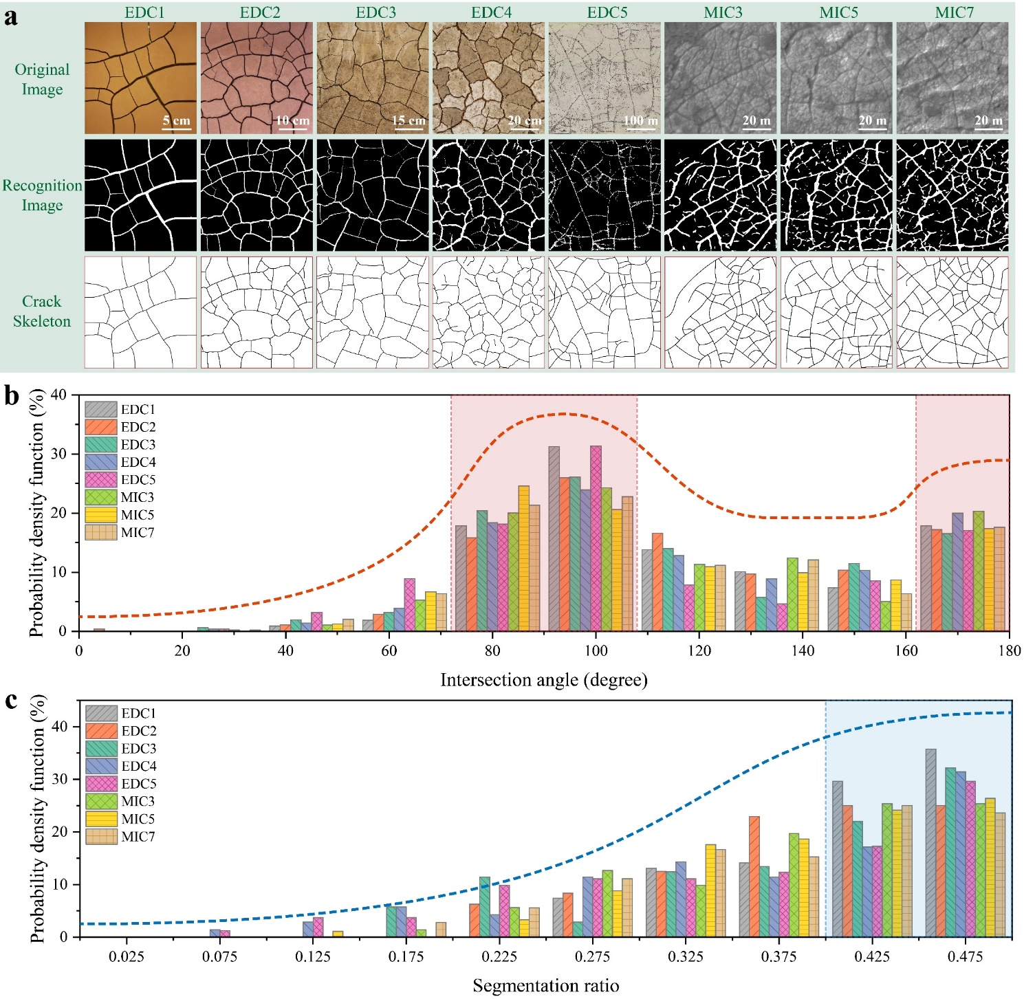 通过对提取出的裂隙骨架进行严格的几何与拓扑分析,研究团队首次在定量层面揭示了火星米级中尺度裂隙(MICs)与地球土体龟裂(EDCs)几何形态的高度一致性(图2)。在几何特征上,两者高度吻合:其裂隙交角均呈现典型的双峰分布特征(集中在80°-100°和170°-180°),裂隙分割比均呈现S型分布(集中在0.40-0.50之间),表明二者裂隙网络均以T型节点正交为主。在拓扑结构上,二者同样高度相似:拓扑空间映射结果显示,火星与地球的裂隙网络均紧密聚集在特定的符号平面区域,主要由T型节点以及四边形或五边形单元组成。这种在几何特征与拓扑结构形态上的高度相似性表明,尽管地球与火星在物质组成和空间尺度上存在差异,但这两种裂隙网络遵循着极其相似的形成与演化机制。