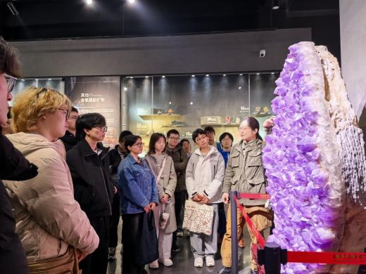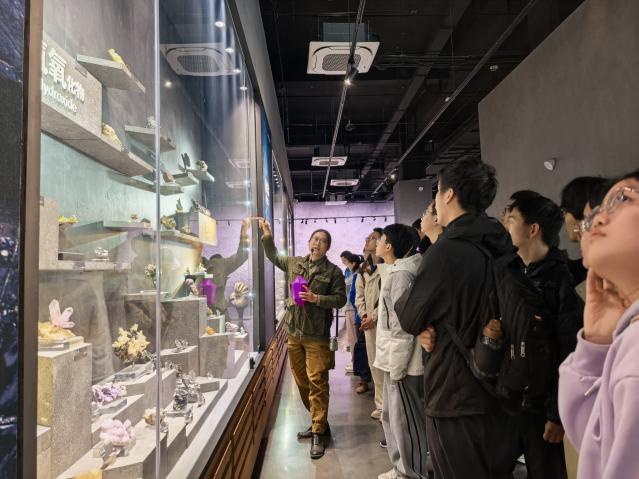 行程最后一站,师生们来到南京首家以矿物晶体、化石、陨石为主题的科普艺术馆——南京矿物文化艺术馆。馆内珍品琳琅满目,五彩斑斓的矿物晶体、形态各异的化石、神秘莫测的陨石,令人目不暇接。在专业人员的讲解下,同学们不仅了解了矿物的形成过程与科学属性,更被大自然鬼斧神工般的艺术之美深深震撼。同学们纷纷感慨道“原来地质也可以这么美!”这场视觉与知识的双重盛宴,不仅点燃了同学们的探索热情,也让大家对地学的内涵有了更深层次的感悟。