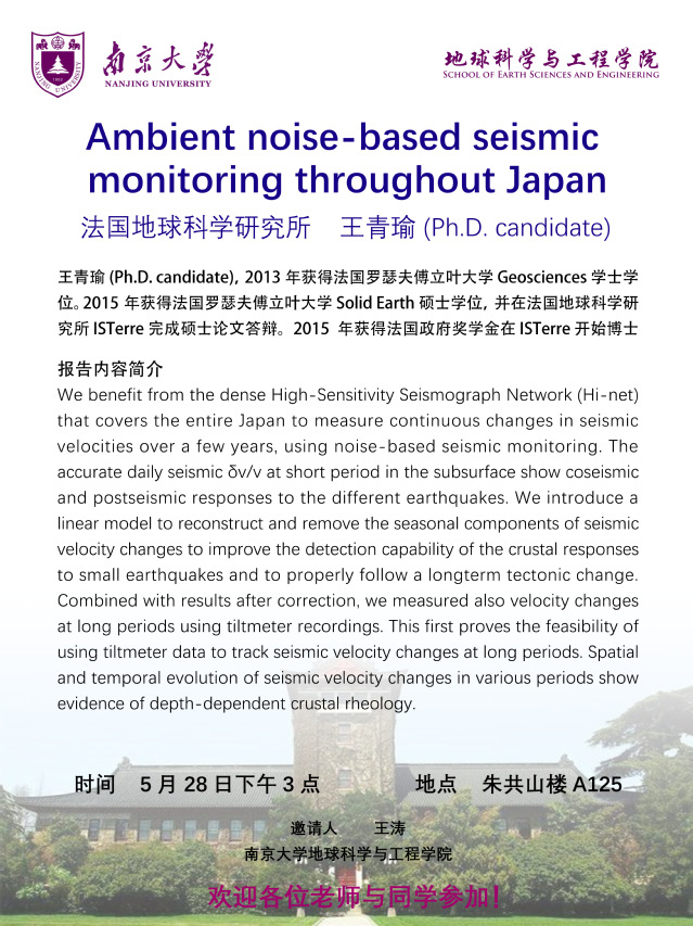 2018-5-28 法国地球科学研究所王青瑜博士报告:Ambient noise-based seismic monitoring throughout Japan