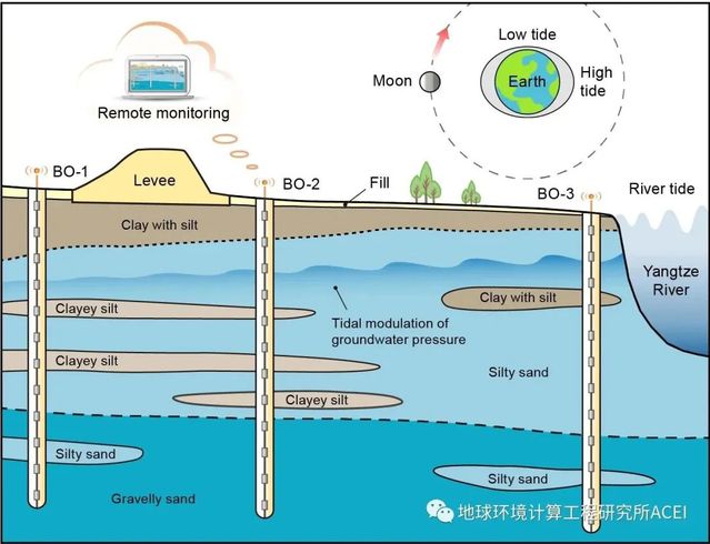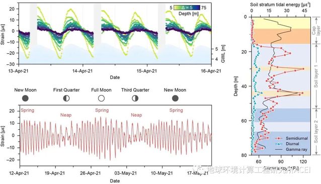 为破解这一谜题,公司施斌教授带领团队研发出了具有微应变精度的超弱光纤光栅地层形变感知系统,并将该系统安装在长江河口区指南村三个70米的钻孔中(图2),首次观测到了地层形变的半日潮(semidiurnal)和大-小潮(spring–neap cycle)现象,并与张诚成博士和荷兰瓦格宁根大学A. J. F. Hoitink教授通力合作,提出了土层潮汐(soil stratum tide)新概念,将其定义为河流潮汐影响范围内由于孔隙水压力波动而引起的土层周期性形变的现象,并揭示了土层潮汐与岩性和深度的依赖关系(图3)。