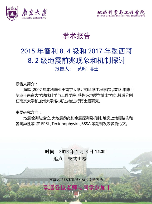 2018-1-8 美国UCLA黄晖博士报告:2015年智利8.4级和2017年墨西哥8.2级地震前兆现象和机制探讨