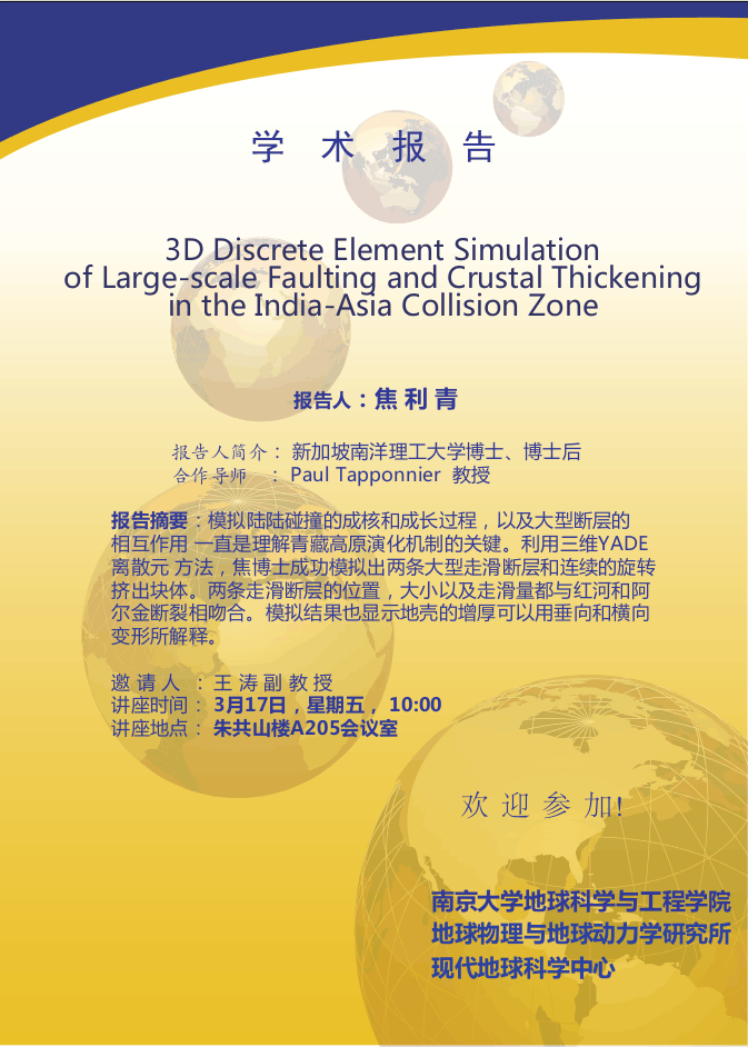 报告题目:3D Discrete Element Simulation of Large-scale Faulting and Crustal Thickening in the India-Asia Collision Zone