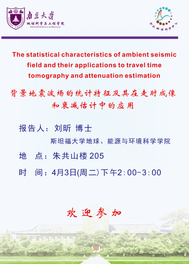 2018-4-3 美国斯坦福大学刘昕博士报告:The statistical characteristics of ambient seismic field and their applications to travel time tomography and attention estimation
