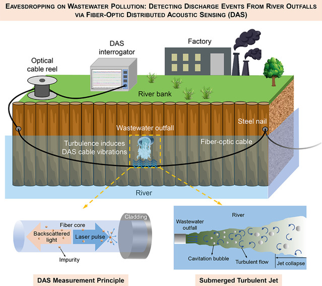 摘要:Wastewater discharge from outfall pipes can significantly impact river water quality and aquatic ecosystems. Effective outfall monitoring is critical for controlling pollution and protecting public health. This study demonstrates a novel distributed acoustic sensing (DAS) approach for detecting wastewater discharge events from outfall pipes located along rivers. Controlled field experiments were conducted in an industrial park river to systematically evaluate DAS performance. DAS detects vibrational signals imparted to suspended fiber-optic cables by turbulent wastewater flows, predominantly within 10–30 Hz, enabling continuous monitoring along entire river lengths. Vibrational power analysis locates outfalls with meter-level accuracy, while time–frequency techniques discern discharge timing and characteristics. Cable type and outfall–fiber separation influence on detection capability was assessed. Thermoplastic-jacketed tight buffer cables optimized detection through enhanced vibrational coupling. Vibrational energy decreased exponentially with separation, highlighting benefits of proximal deployment for sensitivity. However, detection range scales with discharge flow rate. Frequency centroid proved a robust feature with potential for automated discharge identification. Overall, DAS enables high spatiotemporal resolution monitoring to pinpoint concealed outfalls minimally invasively. This positions DAS as a promising tool supporting improved water governance through early pollution warnings and rapid source localization via outfall vibrational signatures emanating across river networks.