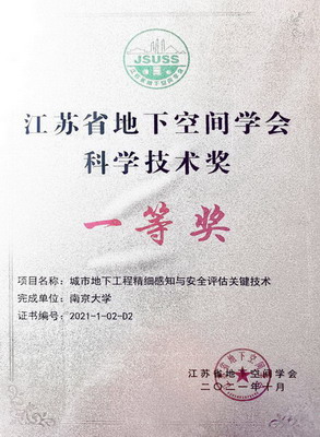 ▌ 2021/10 江苏省地下空间学会科学技术奖一等奖,城市地下工程精细感知与安全评估关键技术