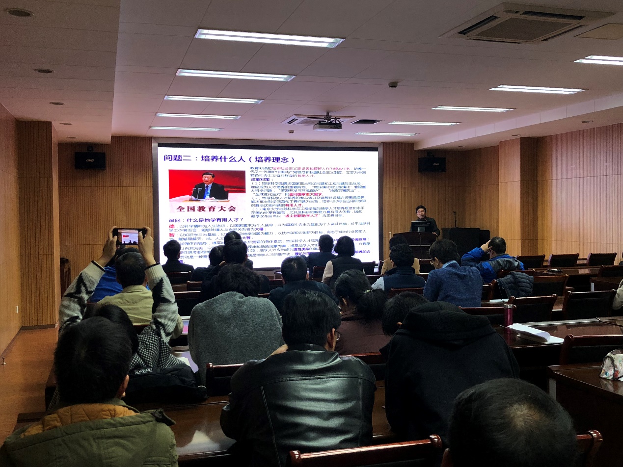其次由分管本科教学的王宝军副经理做了题为“学习全国教育大会精神、深化本科教学改革”的报告,从“为什么要进行本科教学改革,如何进行人才培养改革以及改革顺利进行的保障措施”等三方面做了相关阐述,详细解释了改革中的核心问题——“为谁培养人、培养什么人、怎样培养人”。首先是“为谁培养人”:学院坚持全方位育人的思路,从地球科学的特色、中国特色、学院特色出发,努力培养合格公民,中国特色社会主义的建设者和接班人,培养重大国家需求和科学问题的求解者;其次是“培养什么人”:此次教学改革的落脚点是从德智体美劳五个方面培养具有健全人格的地球系统科学后备军人才;第三是“怎样培养人”,学院将从加强师德师风建设、坚持立德树人出发,把教师队伍建设作为工作的基础,从提升科教融合和教师教学能力、健全地球系统科学理论体系,简化知识总量等方面深化改革,超前布局,培养本科人才的国际视野和战略眼光。王经理最后要求各党支部结合所在学科特色,集中讨论如何在课堂教学中体现“思政元素”,理清本学科的人才培养理念,并围绕培养理念如何开展课程体系建设和课程改革。