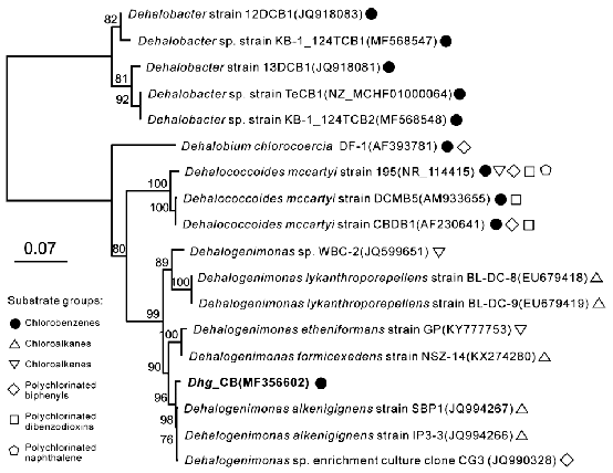 2.基于16S rRNA基因的Dehalogenimonas spp.及其他还原氯苯类物质菌种的系统发育关系的最大似然树