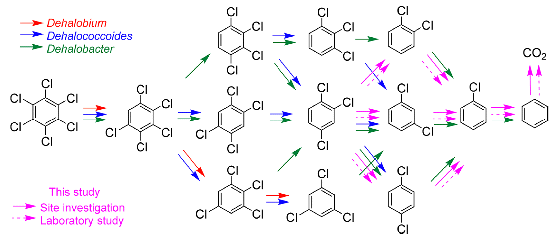 公司水文学及水资源专业吴吉春教授和叶淑君教授团队与加拿大多伦多大学Elizabeth A. Edwards教授团队合作,近日在地下水有机污染物厌氧微生物修复研究中又取得重要成果。该合作团队以南京某工业污染场地地下水为研究对象,通过3期场地调查,连续5年场地地下水污染监测,连续3年的室内微生物实验,确定该污染场地地下水中的1,2,4-三氯苯可通过厌氧微生物降解发生自然衰减,微宇宙实验揭示了1,2,4-三氯苯逐步还原脱氯到毒性更大的苯,再降解为无毒的二氧化碳的完整过程和机制(图1)。为查明上述厌氧微生物还原过程中的功能菌,开展系列微宇宙实验,通过分子生物学技术,发现污染场地中存在一种新型的未被报道的氯苯类物质还原脱氯菌Dehalogenimonas(图2),该菌可以将1,2,4-三氯苯以2%/10%/88%的摩尔比还原脱氯至1,2-1,3-1,4-二氯苯,以及将1,2-1,3-二氯苯还原脱氯至氯苯;1,4-二氯苯和氯苯还原脱氯反应的功能菌为Dehalobacter;氯苯类物质还原脱氯最终产物苯,在厌氧条件下被功能菌Deltaproteobacteria ORM2矿化为无毒产物二氧化碳。上述研究中的重要成果为:首次发现并揭示氯苯类有机物在场地和实验室均可实现原位厌氧条件下完全的微生物降解,其中突破性成果是发现新型氯苯类物质的还原脱氯菌Dehalogenimonas这些成果对地下水氯苯类污染物原位修复研究与应用具有重要的意义和价值。