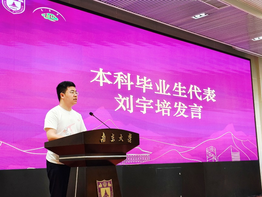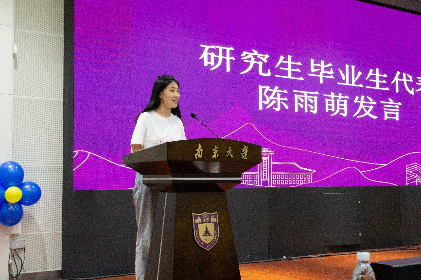 硕士毕业生陈雨萌同员工在发言中感谢师恩,并誓言将所学贡献于国家发展建设。她表示毕业生们将铭记责任,勇于担当,肩负起时代之责,发挥好青年中流砥柱的作用,在国家发展建设的广阔舞台上,传递和弘扬“嚼得菜根,做得大事”的南大精神。其次作为南大学子,应当不负韶华,从容面对未来艰难挑战,继承南大地科榜样力量,传承南大品质精神,在逆境中坚持、在困难中崛起、在黑暗中传递温暖与明亮,为全面建设社会主义现代化国家贡献青春力量。最后,她祝愿学校、学院和老师未来更加美好。