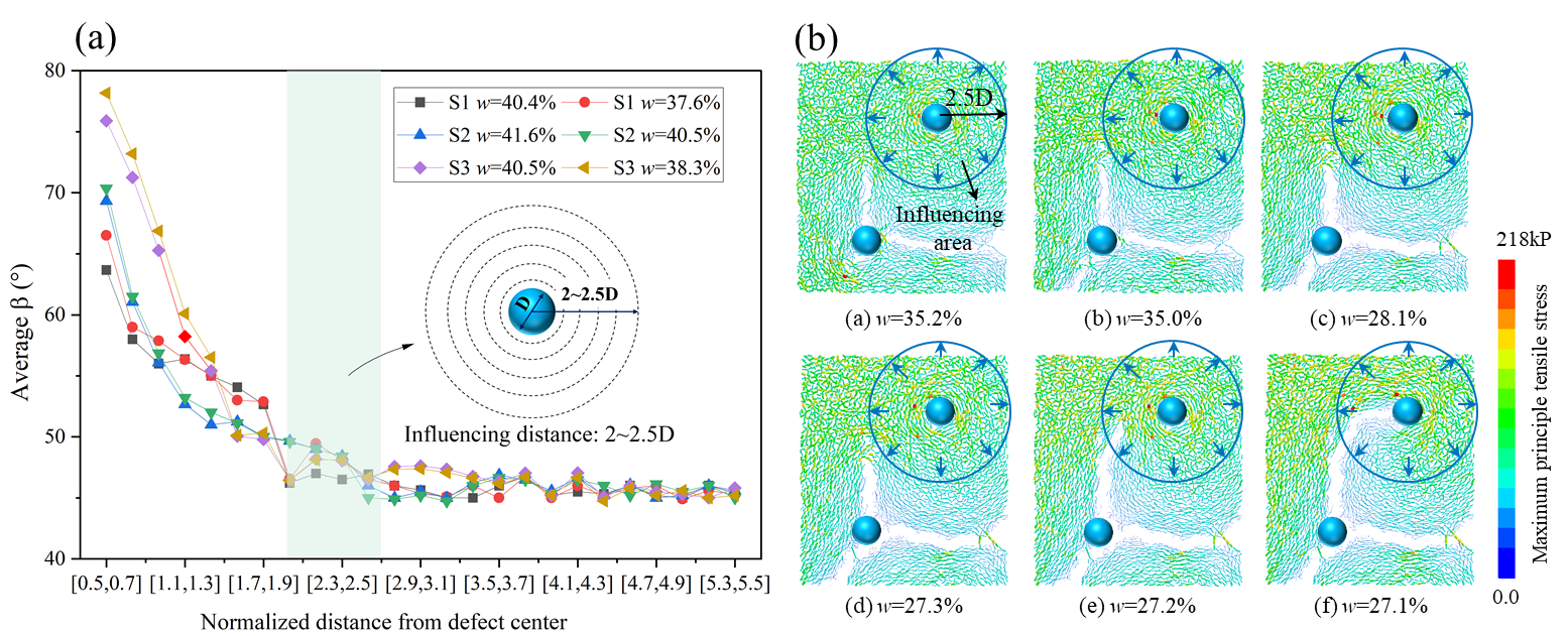 针对这一科学难题,公司唐朝生教授课题组创新地采用离散单元法(DEM)构建了耦合土体干缩变形与表面蒸发的数值模型(图2),通过系统模拟含不同尺寸、空间分布及数量配比表面瑕疵的土样干燥过程,定量揭示了表面瑕疵在干缩裂隙形成与发展过程中的关键作用。研究发现,瑕疵点在其周围约2.5倍直径范围内可引发显著的主拉应力集中,进而形成弧形微裂隙,并最终演化为典型的“Y”型裂隙(图3)。一旦已有裂隙进入该影响区,裂隙路径将发生偏转并逐步向瑕疵点汇聚,表现出明显的“裂隙吸引”效应(图4)。此外,表面瑕疵还会打破均质土体中裂隙的级序发育规律,导致裂隙网络呈现出正交与非正交形态共存的特征。该成果首次定量揭示了表面瑕疵结构对土体应力场与开裂模式的主控作用机制,阐明了结构非均质性如何改变裂隙形态与演化路径。这一认识不仅拓展了土体龟裂的理论基础,也为边坡工程、填埋场覆盖层等涉裂结构设计提供了重要科学支撑。