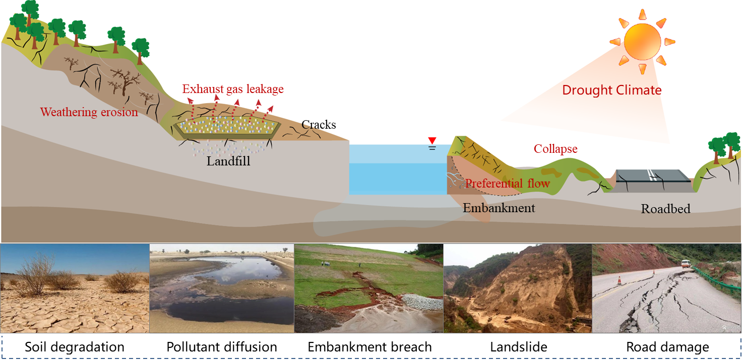 在干旱气候条件下,土体龟裂是一种普遍存在的自然现象。裂隙的产生会显著破坏土体结构完整性,导致其工程力学性能急剧劣化,进而诱发边坡失稳、土体退化等一系列工程地质与环境地质问题(图1)。尽管大量试验与野外观测已证实土体表面瑕疵结构(如砂粒、气泡、微坑等)是裂隙优先发育的位点,但由于传统试验技术难以实时捕捉干缩过程中土体内部应力场的动态演化,关于瑕疵结构触发龟裂的微观力学机制仍存在理论空白。