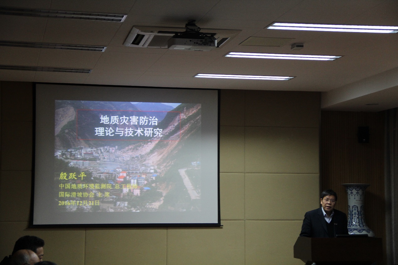 仪式结束后,殷研究员做了题为“地质灾害防治理论与技术研究”的报告。结合三十多年的工作,殷研究员从地质灾害类型及分布、地震区地质灾害及防治、水库区地质灾害及防治、城镇化地质灾害及防治等四个主要方面深入浅出地介绍了几种典型的地质灾害及其防治理论与技术,引起了在场人员的广泛兴趣。地质工程专业的老前辈罗国煜先生做了最后点评,建议年轻的地质工程人要养成良好的学术习惯、钻研新的问题、做一个坚持自我的人。