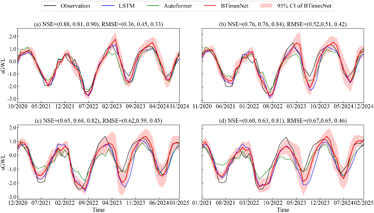 上述研究成果为地下水位的长期概率预测提供了更可靠的框架,有望在干旱预警、水资源调度与地下水可持续利用等领域发挥重要作用,体现了深度学习在地球系统科学中的广泛应用前景。该成果在近期以“An explainable Bayesian TimesNet for probabilistic groundwater level prediction”为题,发表于国际水文学领域权威期刊《Water Resources Research》,硕士研究生彭泽辰为论文第一作者,莫绍星助理教授和吴吉春教授为通讯作者,合作者包括bw必威西汉姆联官网曾献奎副教授和施小清教授、德克萨斯大学奥斯汀分校lexander Y. Sun教授等。该研究得到国家自然科学基金项目(U2443201、42330718、42472321)资助。