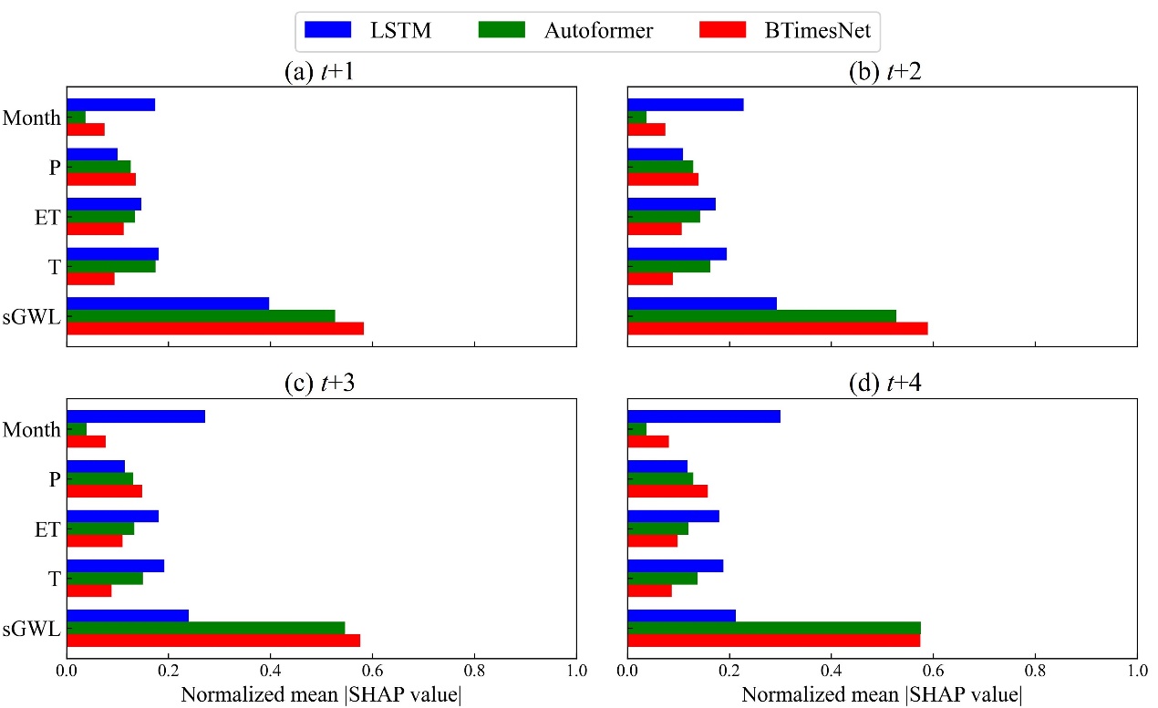 针对上述问题,本研究提出了一种可解释贝叶斯深度学习模型BTimesNet。该模型创新性地将一维地下水位时间序列重构为二维时序矩阵,通过二维卷积神经网络捕捉时序数据周期内(intra-period)与周期间(inter-period)的复杂特征模式(图1),从而提升模型在多步长预测中的表现;验证结果表明,在1至4个月的预测期内,BTimesNet在精度和稳定性上均优于当前主流模型(如LSTM与Autoformer),有效缓解了预测性能随时间推移而下降的问题(图2)。为量化预测不确定性,将Stein变分梯度下降(SVGD)方法引入模型训练过程,求解模型参数的后验分布,进而生成具有置信区间的预测结果(图2);在此基础上,通过SHAP解释算法量化各输入变量对预测结果的贡献,发现历史地下水位是最关键的预测因子(平均贡献约60%),气象变量(降水P、气温T、蒸散发ET)提供了约30%的辅助信息(图3),有效提升了模型的透明度与可信度。值得一提的是,BTimesNet模型仅依赖历史地下水位与气象再分析数据即可运行,具有良好的适应性与推广潜力。