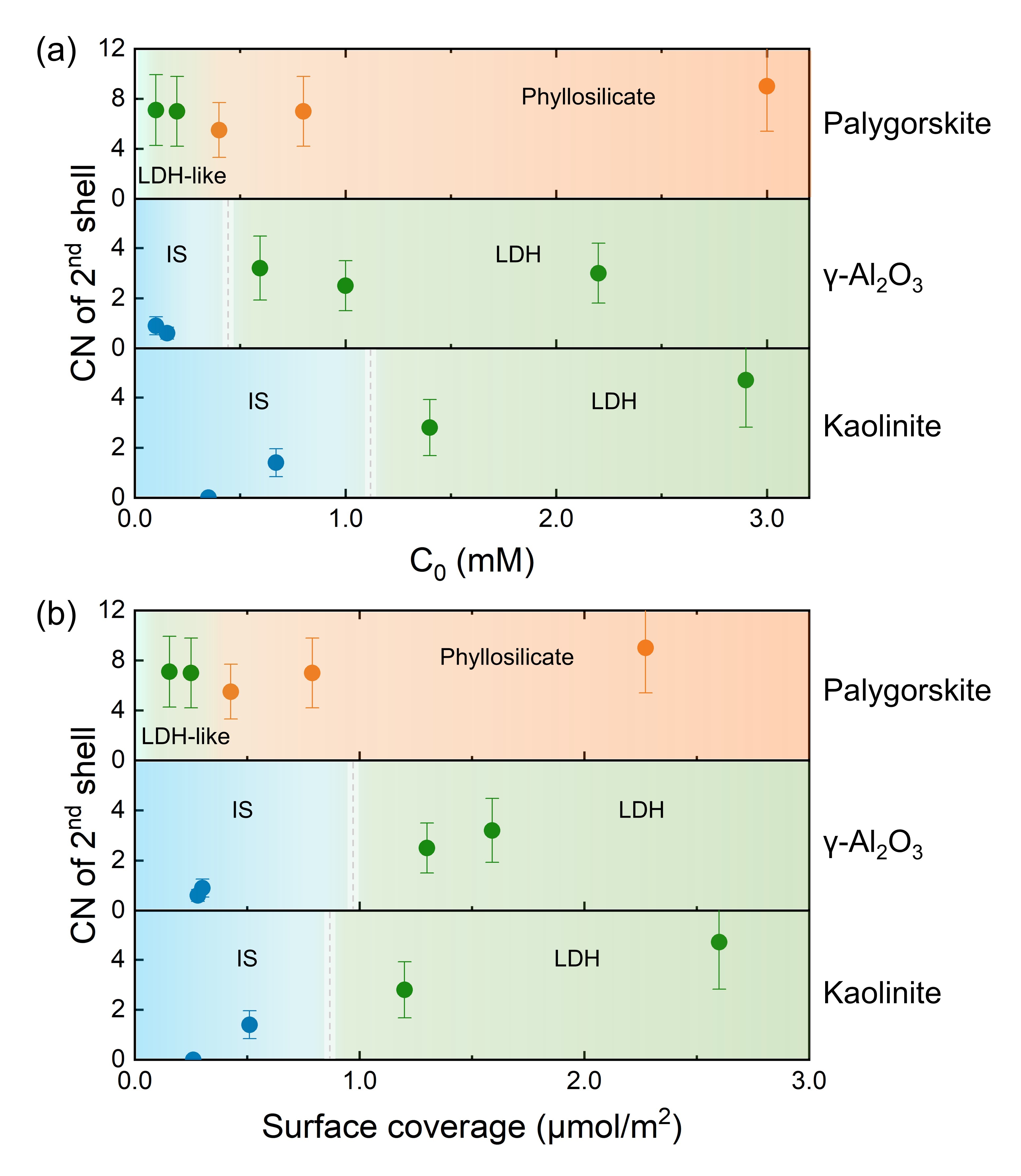 矿物承载力,即一定物理化学条件下矿物晶格或表面负载“客体组分”的能力,是表面矿物学和低温地球化学领域的前沿问题。经典的矿物表面承载力模式认为,矿物表面存在相对固定的吸附位点容量,达到饱和后便难以继续固持金属离子。值得注意的是,富镁链层状黏土矿物凹凸棒石展现出一种独特的“承载力跃升”现象:在远低于高岭石、γ-Al2O3等常见矿物的初始钴浓度(0.1 mM vs. ≥0.6 mM)和表面覆盖度(0.15 μmol/m2 vs. ≥1.2 μmol/m2)条件下,凹凸棒石即可诱导表面沉淀形成,从而突破传统吸附位点的容量限制【图1】。这种由表面吸附向沉淀结晶的机制转变,是其实现承载力跃升的关键,但其背后的微观调控机制一直是个难题。