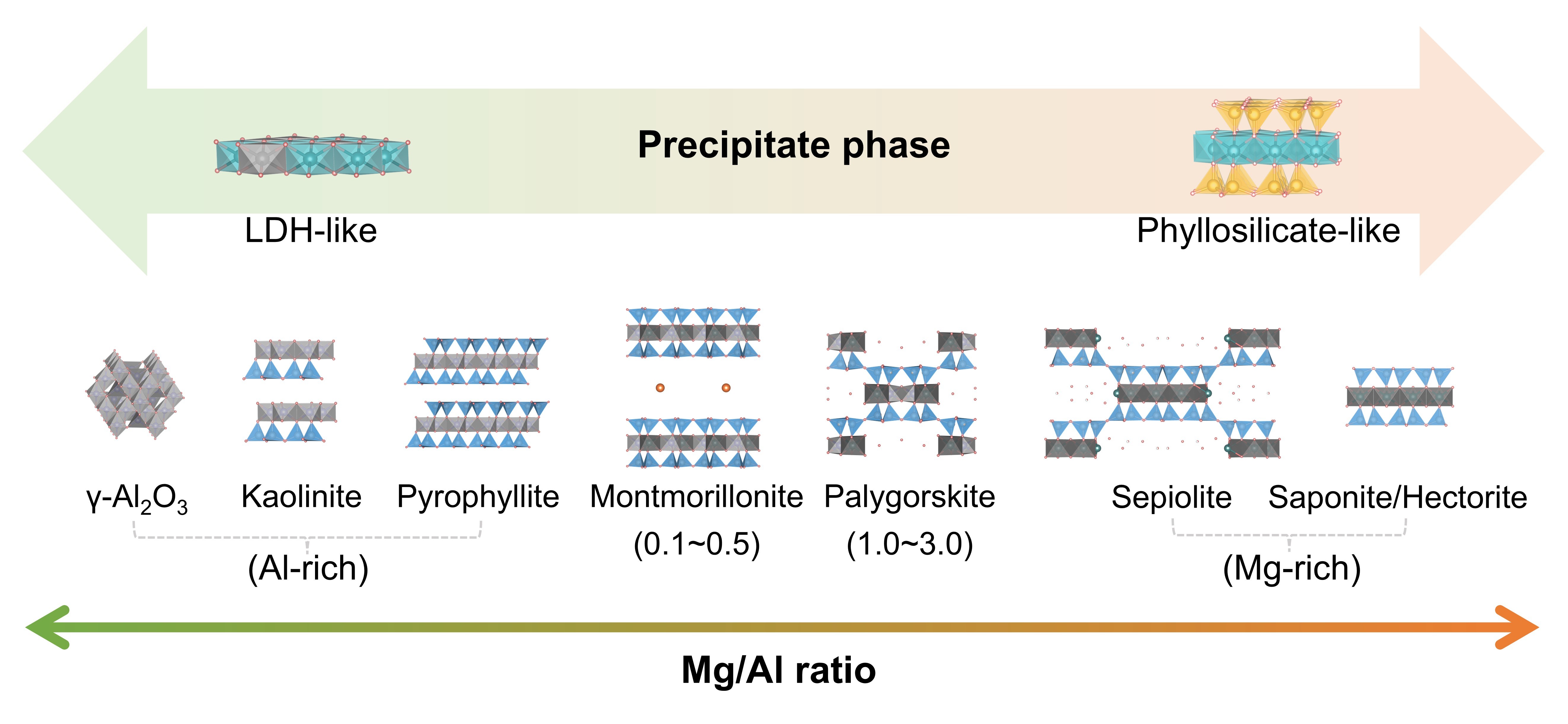 矿物模板——决定沉淀类型与跃升路径:研究进一步表明,矿物本身的化学组成对承载力跃升的路径具有决定性作用。矿物的镁/铝比影响了次生金属沉淀相的类型:富镁黏土(凹凸棒石、海泡石、皂石)更易诱导形成层状硅酸盐型沉淀,而富铝矿物(高岭石、γ-Al2O3)则优先形成LDH型沉淀【图3】。这一“矿物模板效应”意味着,不同矿物因其晶体化学特性,承载力的跃升路径和最终达到的容量存在本质差异。