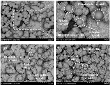 图1 不同温度条件下微生物诱导生成碳酸钙晶体的SEM图像