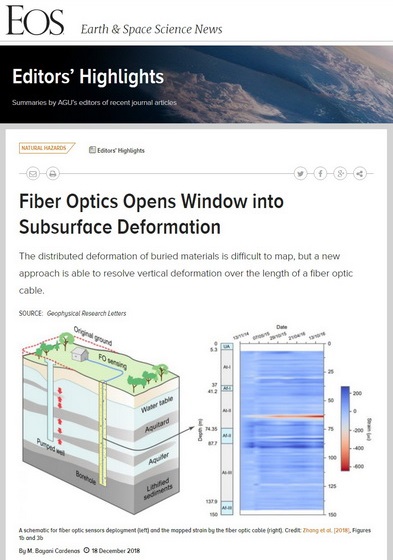 近日,美国地球物理学会(AGU)旗下《地球与空间科学新闻》(Eos)以编辑视点(Editors' Highlights)版面,以“Fiber optics opens window into subsurface deformation”(光纤打开地下深部变形之窗)为题,报道了bw必威西汉姆联官网施斌教授团队在光纤感测地下深部变形方向的最新研究进展。撰稿人美国德克萨斯大学奥斯汀分校地球科学学院M. Bayani Cardenas教授指出,精准定位地下深部压缩变形层位是一项极具挑战性的课题,而采用光纤感测技术可获取分布式、精细化的竖向变形信息并确定变形热区的位置,这为光纤感测技术在地质(岩土)力学与水文学领域的应用提供了很多的机会。