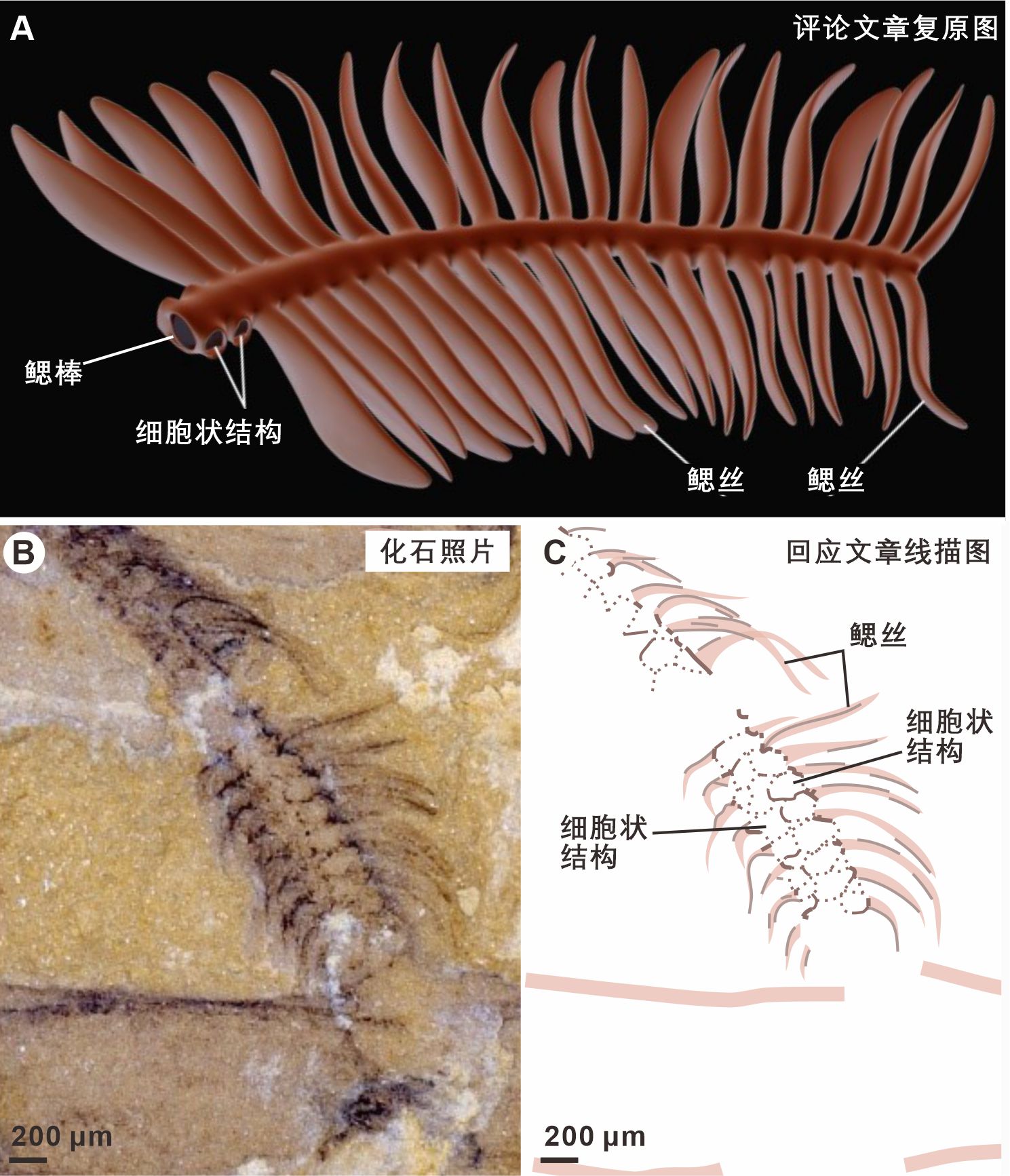 图1. 云南虫鳃弓形态。(A)He等评述文章中的鳃弓复原图认为鳃棒呈中空管状。(B–C)原作者团队根据He等提供的化石照片(B)重新解释了鳃棒内部并非中空,而是由多排2–3个细胞状结构组成(C)。(A–B)来自(He et al., 2023),(C)来自(Tian et al., 2023)。