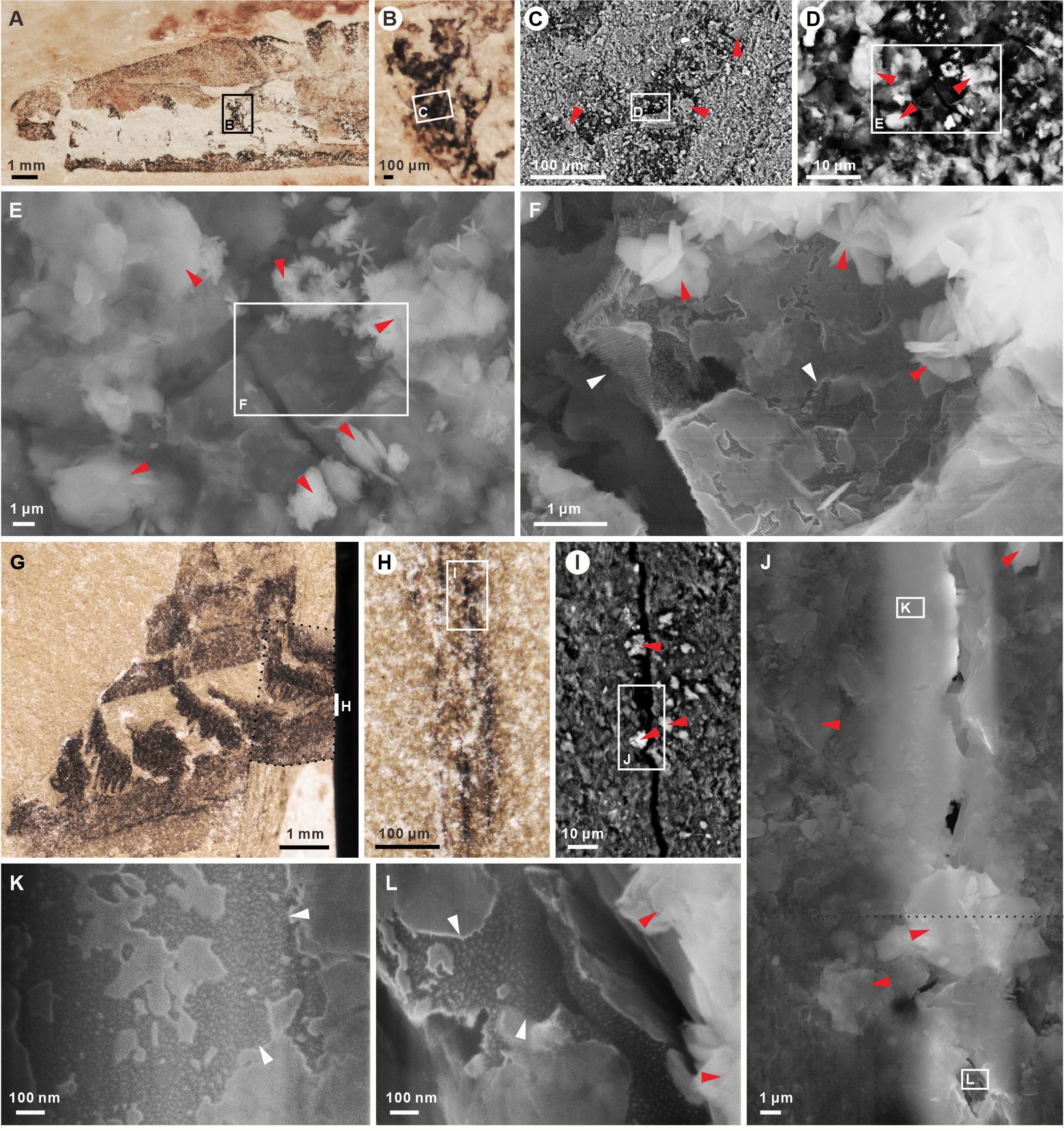 图4. 逐步放大的扫描电镜照片。(A–F)在化石表面,碳膜上有沉积物颗粒覆盖;(G–L)在化石截面上,碳膜被紧紧地夹在两层沉积物之间。红色三角形指示沉积物颗粒,白色三角形指示微原纤维构造。来自(Tian et al., 2023)。