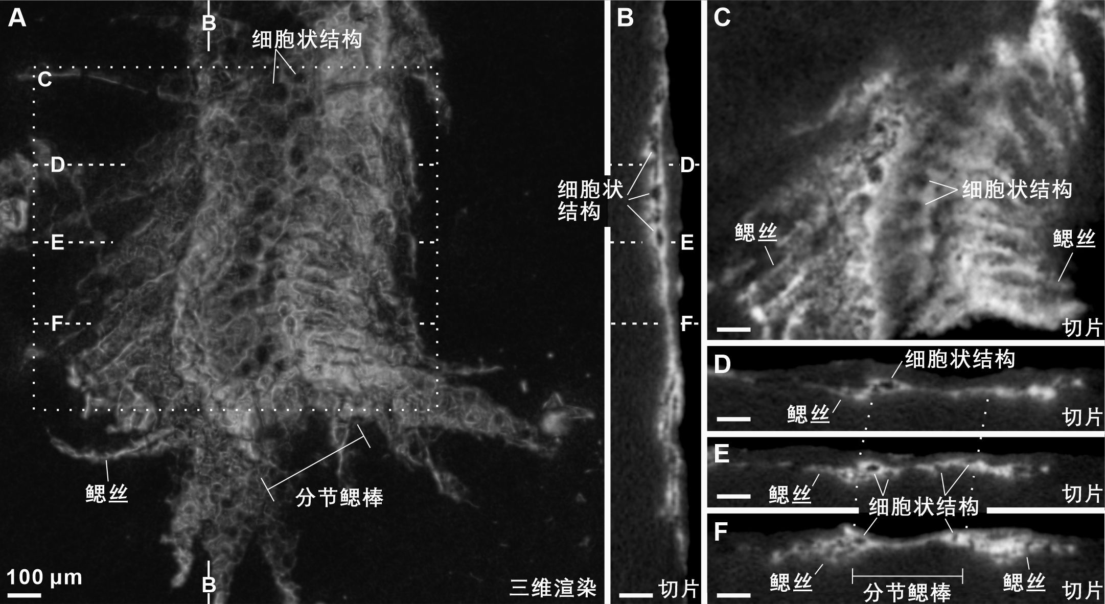 图2. 回应文章中展示的云南虫鳃弓的CT三维渲染和切片。(A)鳃棒内部并不是中空管状,而是由多排细胞状结构组成。(B–F)三个方向的切片都显示细胞状结构是密闭空心的,与鳃丝并不相通,不是鳃丝根部底座。比例尺均为100 μm。修改自(Tian et al., 2023)。