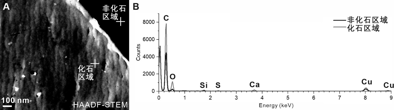 图3. 透射电镜样品的高角环形暗场像(HAADF-STEM)和能量色散X射线光谱,显示了化石微原纤维区域主要由碳元素组成。修改自(Tian et al., 2023)。