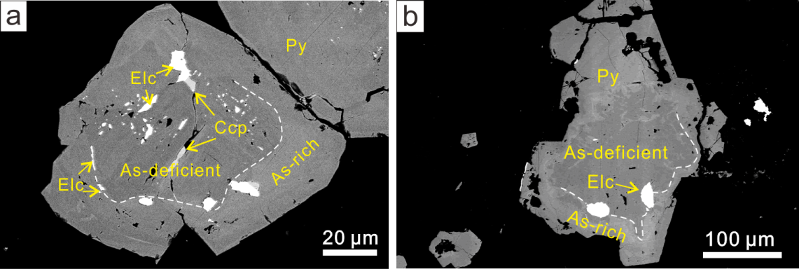 (1) 邱村金矿黄铁矿(Py)普遍发育富砷环带,银金矿(Elc)优先赋存于黄铁矿贫砷-富砷界面上,或者充填于黄铁矿颗粒内部微裂隙中 (图1),或者赋存于黄铁矿颗粒之间的晶界位置 (图2),指示银金矿的形成与富砷流体密切相关。