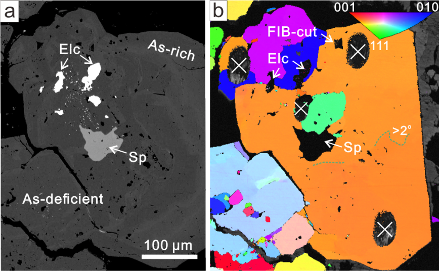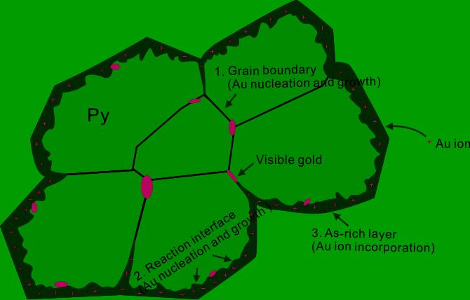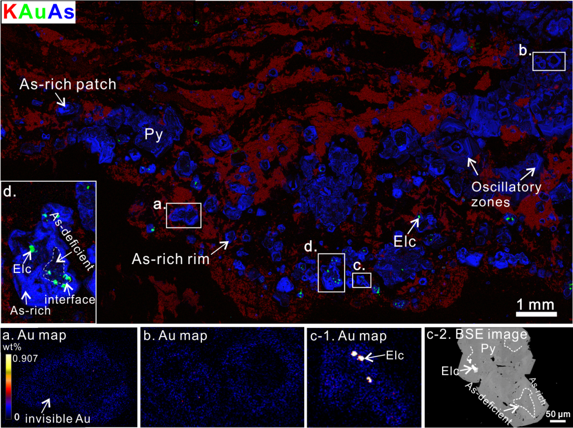 Zhang, H., Cai, Y.F., Sha, G., Brugger, J., Pring, A., Ni, P., Qian, G.J., Luo, Z,J., Zhang, Y., and Tan, W. (2022) Effects of arsenic on the distribution and mode of occurrence of gold during fluid-pyrite interaction: A case study of pyrite from the Qiucun gold deposit, China. American Mineralogist, 107(5), 914–929. https://doi.org/10.2138/am-2021-7675.