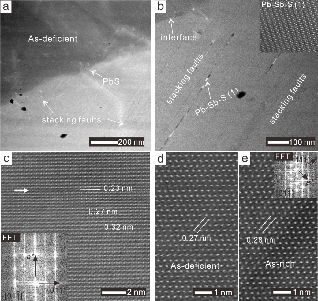 图4 含砷黄铁矿HAADF-STEM照片:(a–b)堆垛层错和纳米颗粒的分布;(c) 局部位置(200)面网中发育面缺陷(箭头位置);(d–e) 富砷区域面网间距增大,插图为对应区域的快速傅里叶变换。