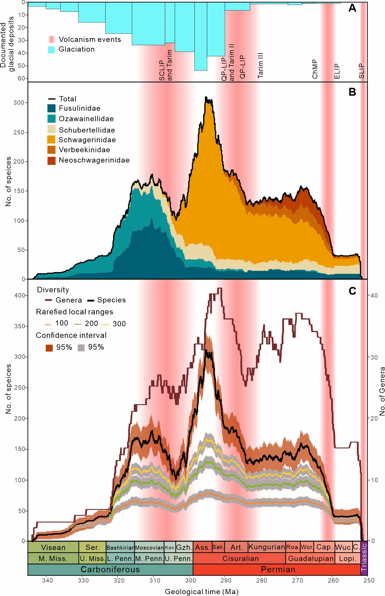 图2 晚古生代冰期、火山事件和䗴类有孔虫的高精度多样性变化关系(Zhang et al., 2025)