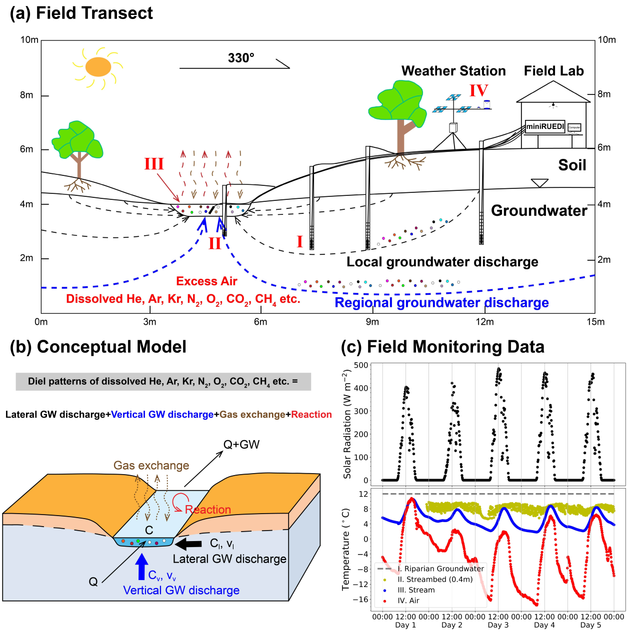 相关成果于2023年8月以“Quantifying Carbon Cycling across the Groundwater–Stream–Atmosphere Continuum Using High-Resolution Time Series of Multiple Dissolved Gases”为题发表于《Environmental Science & Technology》。论文第一作者为博士生研究生汪钏,通讯作者为谢月清教授,合作者包括瑞士联邦水科学技术研究院Matthias S. Brennwald博士、Rolf Kipfer教授、西澳大学James L. McCallum教授、bw必威西汉姆联官网博士研究生戴鑫和吴吉春教授。此研究得到了国家自然科学基金、关键地球物质循环前沿科学中心、中央高校基本科研基金、bw必威西汉姆联官网登峰人才计划B层次、江苏特聘教授项目和瑞士碳中和及碳封存DemoUpStorage项目的联合资助和支持。