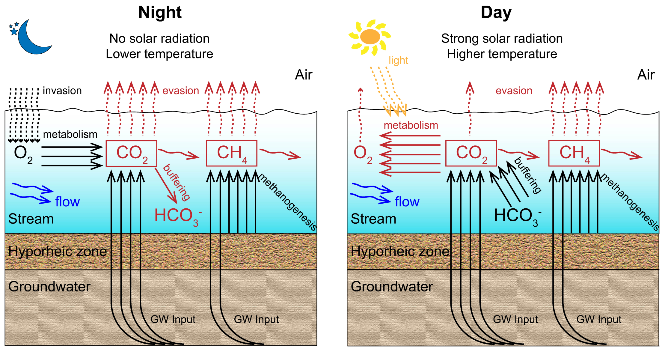 图3 昼夜尺度“地下水–河流–大气”连续体碳循环概念示意图