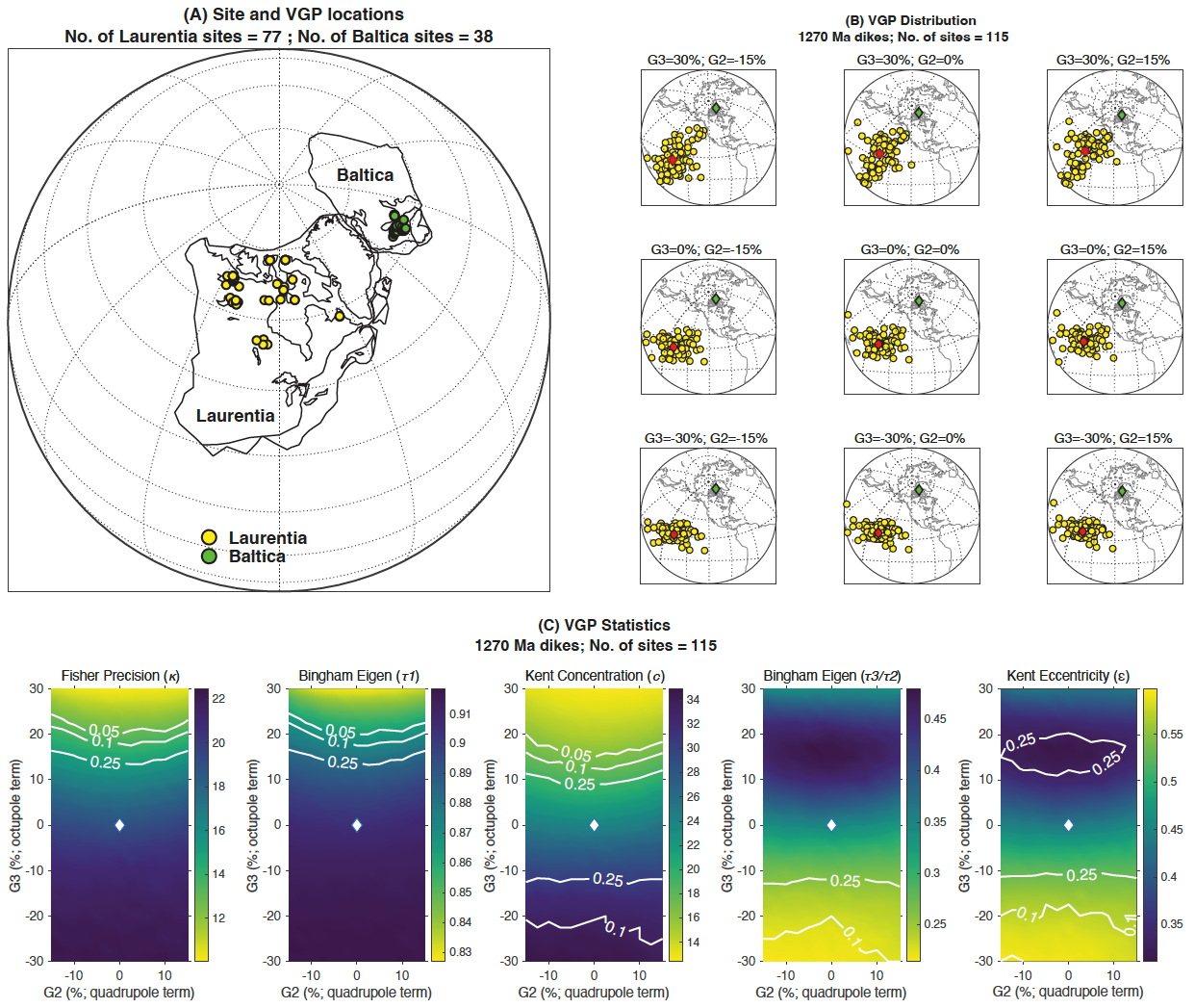 图2:(A) 约12.7亿年劳伦大陆和波罗的大陆的古地理相对位置重建模型。黄色和绿色圆圈显示12.7亿年基性岩墙的采样点位置。(B, C) 不同轴向非偶极子场贡献下地磁极空间分布和球面统计。红色菱形代表地磁极的平均值,绿色菱形显示采样点位置的平均值。白色菱形显示地心轴向偶极子场情形,白色等值线为零假设(即非偶极子场与GAD场统计参数没有显著差异)的p值。
