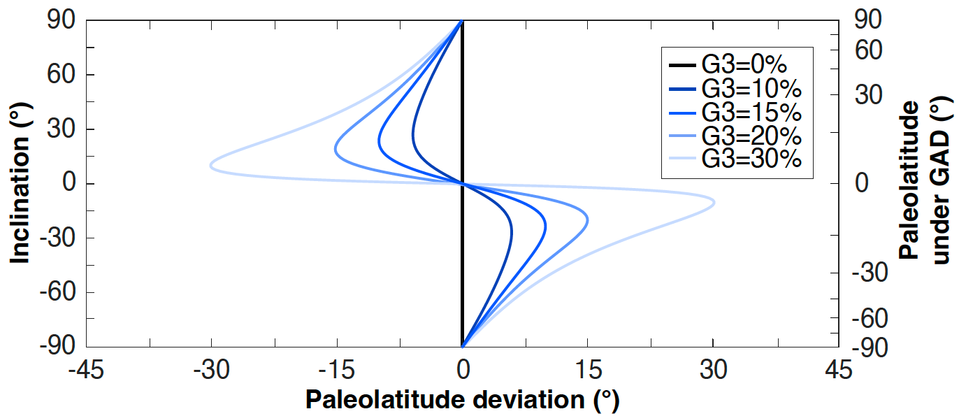 图3:由轴向八极子场成分变化引起的古纬度估算偏差