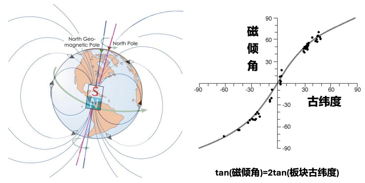 图1:(左)现代地磁场符合地心轴向偶极子场模型。(右)在地心轴向偶极子场模型下,板块古纬度与地磁倾角存在一一对应关系,据此可对板块古地理位置定量恢复。