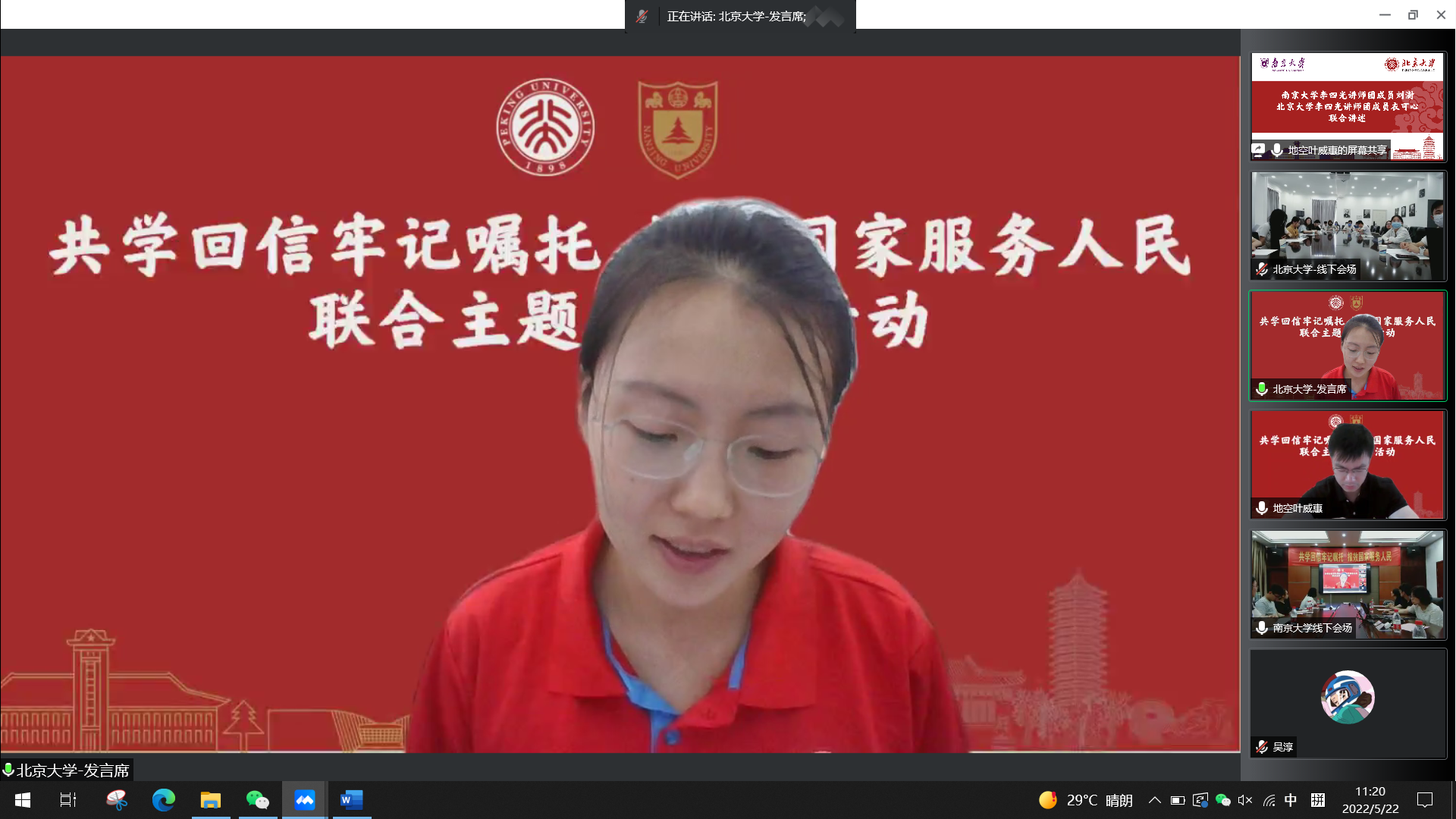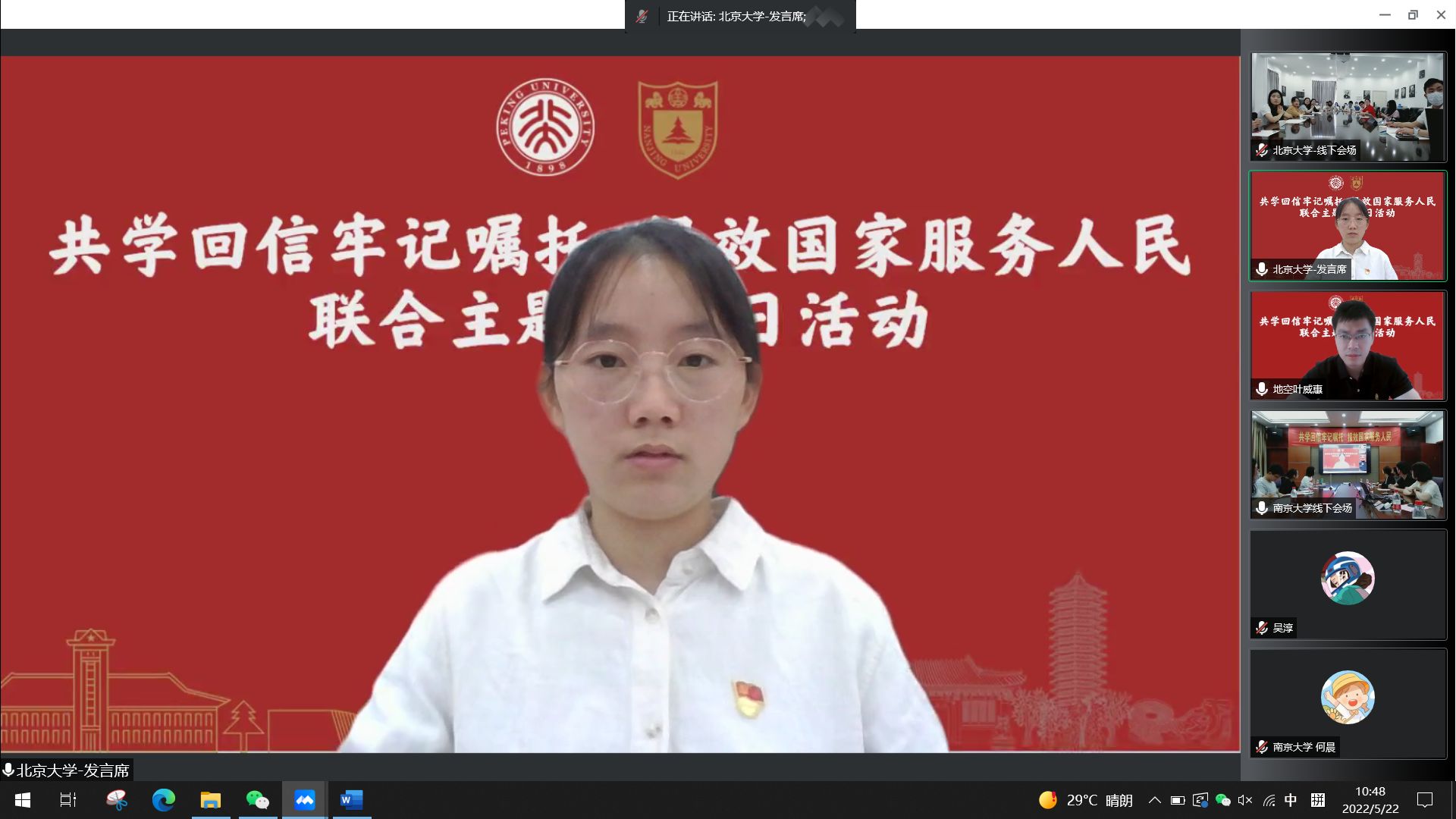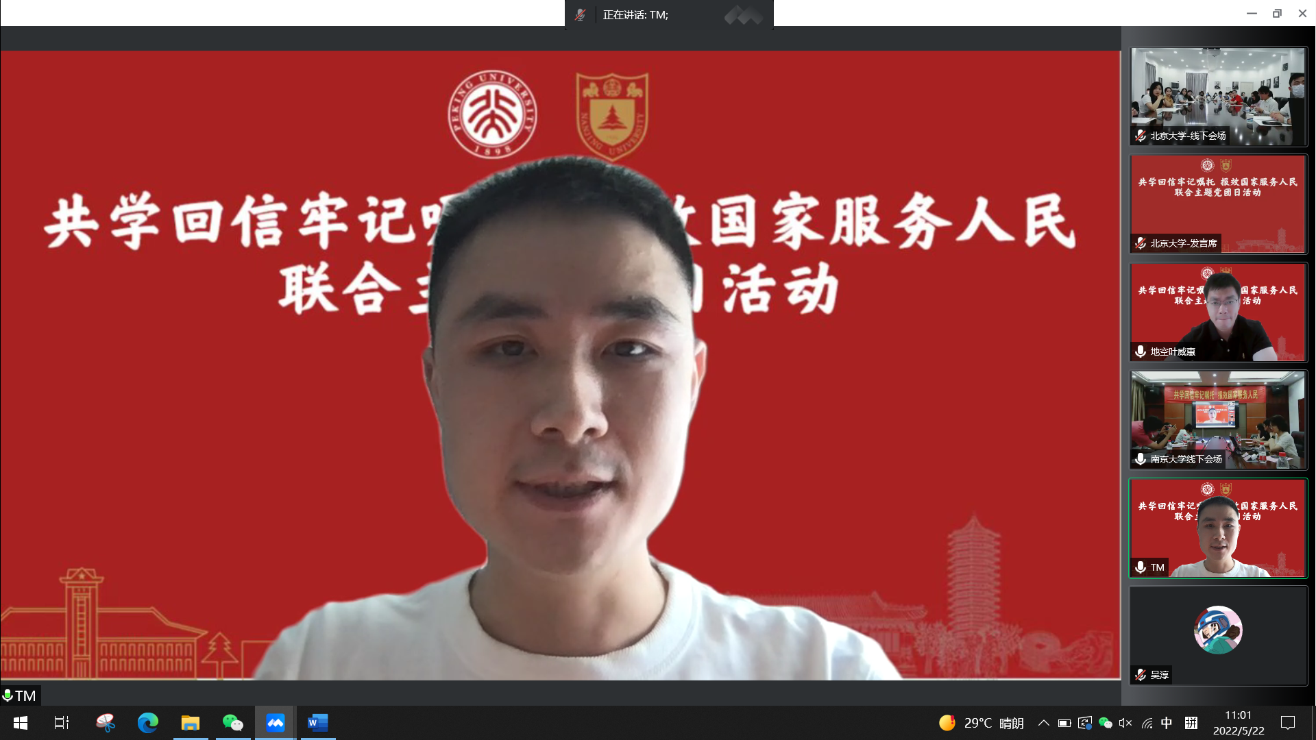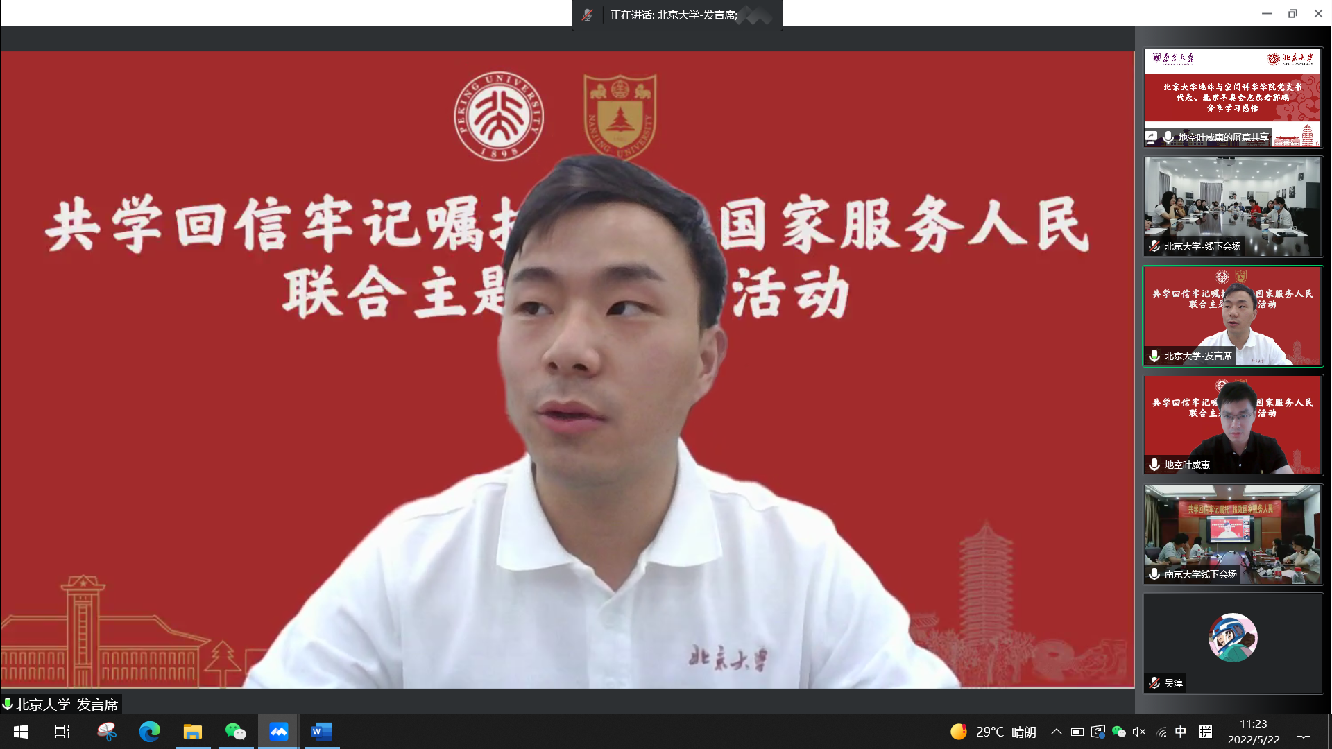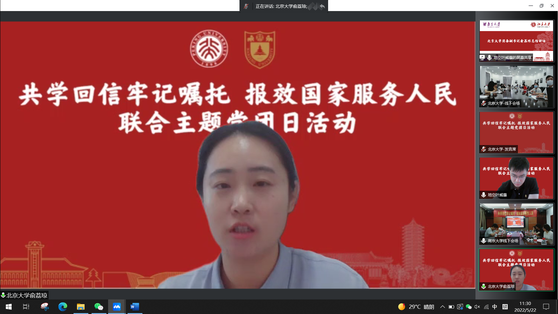 为深入学习贯彻落实习近平总书记给bw必威西汉姆联官网留学归国青年学者的回信精神,落实立德树人的根本任务,切实引领广大青年学子坚定理想信念,胸怀“国之大者”,坚定报效国家、服务人民的自觉追求,推动科技自立自强,2022年5月22日上午,bw必威西汉姆联官网和北京大学团委、地球与空间科学学院云端连线,联合开展“共学回信牢记嘱托 报效国家服务人民”主题党团日活动。bw必威西汉姆联官网地球科学与工程公司党委副书记毛予倩、团委书记陈昕,北京大学团委副书记俞荔琼、地球与空间科学公司党委副书记王一涵、留学归国青年教师代表唐铭出席活动,两校部分员工代表参加活动。