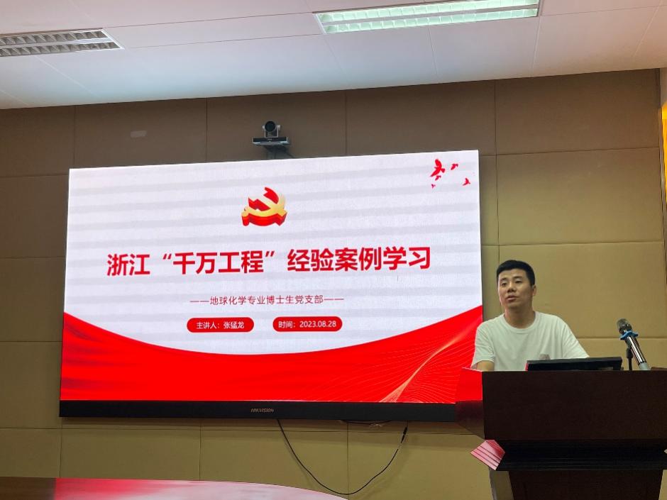 2023年8月28日中午,bw必威西汉姆联官网地化专业博士生支部在朱共山楼A205会议室召开主题党日活动,活动主题为学习习近平总书记在文化传承发展座谈会上的重要讲话精神和浙江“千万工程”的经验案例。活动由支部书记张猛龙同学主持。