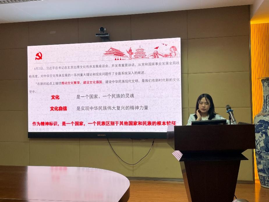 首先由李雯雯同学带领大家学习以“坚定文化自信,沐浴理论之光”为主题的内容。6月2日,习近平总书记在北京出席文化传承发展座谈会并发表重要讲话。习总书记从党和国家事业发展全局战略高度,对中华文化传承发展的一系列重大理论和现实问题作了全面系统深入的阐述。在报告最后,一段《觉醒年代》中有关新文化运动视频剪辑带我们重温那个风云变幻的年代,无数革命先烈在文化战线上抛头颅洒热血、为文化传承和民族延续奋战抗争的身影,再次提醒了每一位同学所肩负的职责与使命。