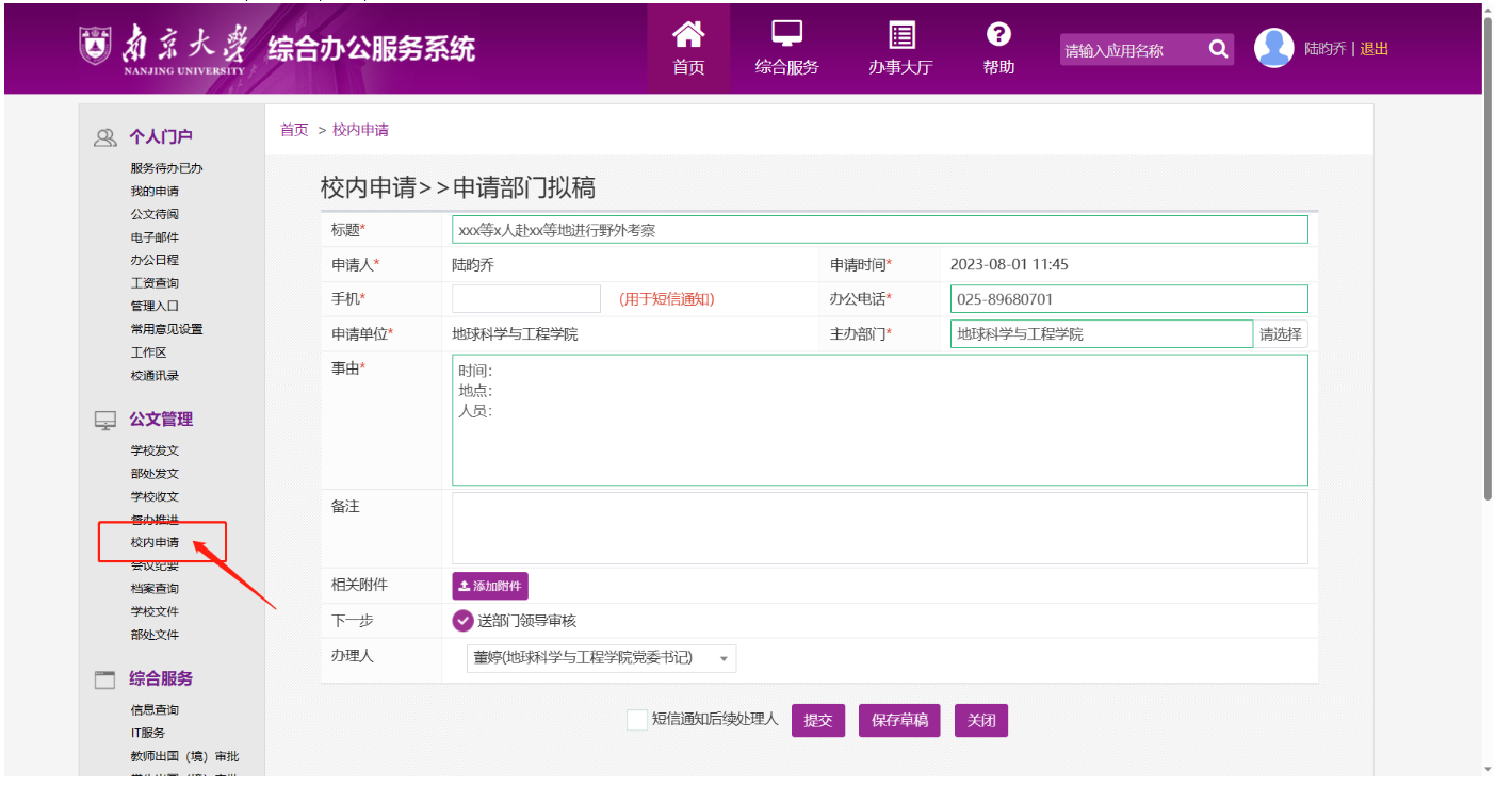 各位师生需遵循“安全第一,预防为主”的工作原则,牢固树立安全意识,统筹做好各项安全工作,确保野外实习和科研工作顺利平安。同时,在教师本人或员工出野外前,需在OA系统“校内申请”中进行备案,具体填写内容可参考图片。