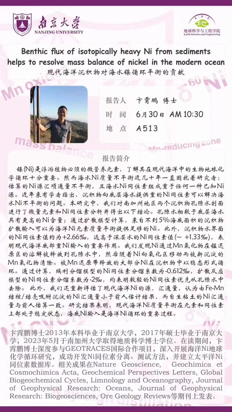 Benthic flux of isotopically heavy Ni from sediments helps to resolve mass balance of nickel in the modern ocean (现代海洋沉积物对海水镍循环平衡的贡献)