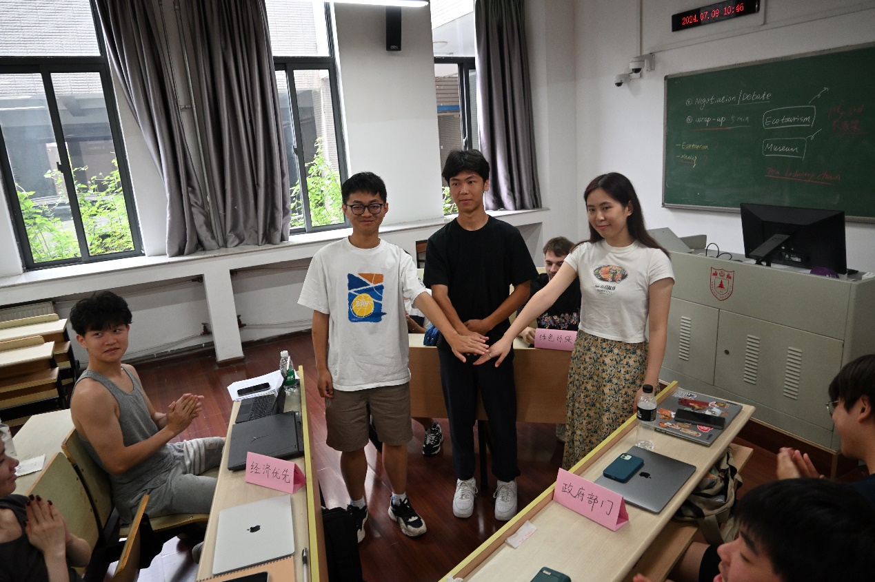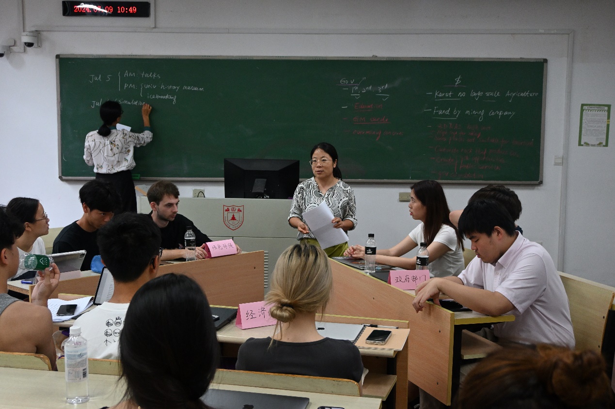 同时,两校员工开展了关于“碳酸盐岩地区资源利用与可持续发展”的模拟协商活动,同学们分为三组扮演开发商,政府部门以及环保机构。活动共分“陈述”、“辩论协商”和“结辩”三个阶段,两地同学激烈辩论,充分交流,碰撞思想,交换观念,最终达成了一致意见。模拟协商的过程让每位同学都对地球关键带的环境效应和可持续发展有了更深刻的理解和更多角度的思考,全英文的讨论形式赋予了活动更国际化的氛围。