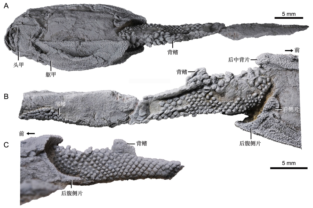 副云南鱼化石扫描结果展示了最原始有颌脊椎动物的完整鳞列。它的背鳍和尾鳍都被厚重的膜质鳞片完全覆盖。扫描显示,副云南鱼鳞片形态具有相当大的分异度,以及复杂的区域分化。同一个体的鳞片在轮廓、膜质骨表面纹饰、冠部比例、覆压方式、大小等形态特征上展现出极大的多样性(图3)。此外,沿着身体纵轴向后,鳞片在不同区域展现出不同的梯度特征,特别是侧鳞沿着身体纵轴向后鳞片逐渐变大,这与绝大多数硬骨鱼相反,并且鳞片由彼此强烈覆压(硬骨鱼鳞片普遍特征)逐渐转变为不覆压(软骨鱼普遍特征)。有意思的是,上述鳞列的分化情况在胴甲鱼类进步类群化石中发生了简化,只有在胴甲鱼类的原始类群中才能观察到这些现象。已知鳞片分区的简化也分别独立地发生在软骨鱼支系、硬骨鱼中的肉鳍鱼和辐鳍鱼支系中。因此,副云南鱼就成为了解有颌脊椎动物祖先鳞列格局最重要的一扇“窗口”。