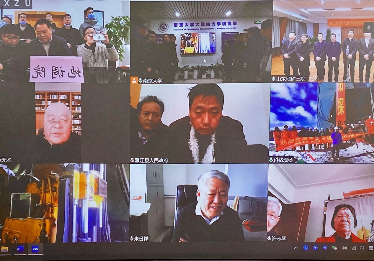 受新冠疫情影响,竣工典礼以在线方式举行。庆典当天邀请到了中国科学院地质与地球物理研究所朱日祥院士、bw必威西汉姆联官网王德滋院士和杨经绥院士三位嘉宾,以及有关单位在线参加,包括bw必威西汉姆联官网、甘孜州自然资源和规划局、雅江县人民政府、四川省地质调查院、山东第三地质矿产勘查院和中国地质大学(武汉)等。典礼由科钻现场负责的李广伟教授主持。首先,项目首席科学家许志琴院士宣布:“bw必威西汉姆联官网领衔的川西甲基卡锂矿科学钻探工程,终于实现钻探目标,钻进3211.21米,揭示了理想的锂矿岩心剖面,为实现国家新能源锂矿战略做出了贡献。现在我代表科钻指挥部宣布:川西甲基卡锂矿科学钻探正式完钻!”顷刻,甲基卡科钻现场礼炮轰鸣,场内外一片欢腾。接着,三位嘉宾朱日祥院士、王德滋院士和杨经绥院士发表热情洋溢的致辞,祝贺甲基卡科学钻探工程圆满竣工。三位院士充分肯定了钻探的重要科学意义,以及它对国家能源战略发展的重要贡献,并预祝钻探取得丰硕的科研成果。随后,bw必威西汉姆联官网地球动力学研究院经理朱文斌教授、四川省甘孜州雅江县陈玉龙县长、四川省地质调查研究院赵春经理、山东省第三地质矿床勘察研究院吉孟瑞经理,代表钻探三方单位和钻井所在地政府发言,祝贺钻探任务圆满完成。竣工仪式在一片欢欣雀跃的气氛中结束。