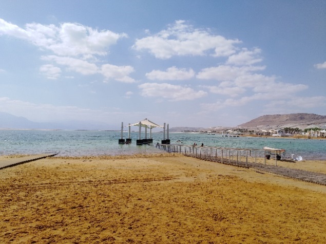 期待已久的死海在前方召唤。一下车,同学们迫不及待地向沙滩跑去。阳光明媚,微风习习,碧海蓝天,令人心旷神怡。死海的水比想象中的清澈,味道却还是咸涩的。海岸边积累了一层白花花的盐,在海里也随处可捡到结晶漂亮的盐块。这里的盐度是普通海水的十倍,因此,死海里几乎见不到生物。