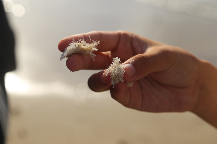 走过基岩海岸,来到沙滩上。浅黄的沙上散布红色或白色的藻类。它们原本固着在基岩上,死亡后被海水冲到了这里。经过长期的日晒雨淋,腐蚀风化,已经露出了白色的骨骼,主要成分是碳酸钙。