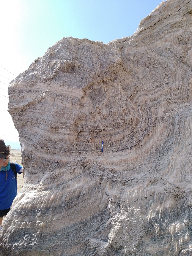 第二天一早,我们并没有直接前往海滩,而是来到了死海南部的一座盐丘的脚下。它几乎完全是由盐(NaCl)组成的。山的下部地层近乎直立,而上部地层水平。这是由于地下应力的作用,下层高塑性的岩体向上流动并推挤插入上覆岩层,这种作用被称为底辟作用。