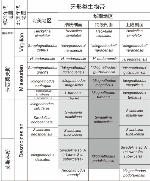 图2 华南地区与北美地区莫斯科阶–卡西莫夫阶牙形类生物地层对比