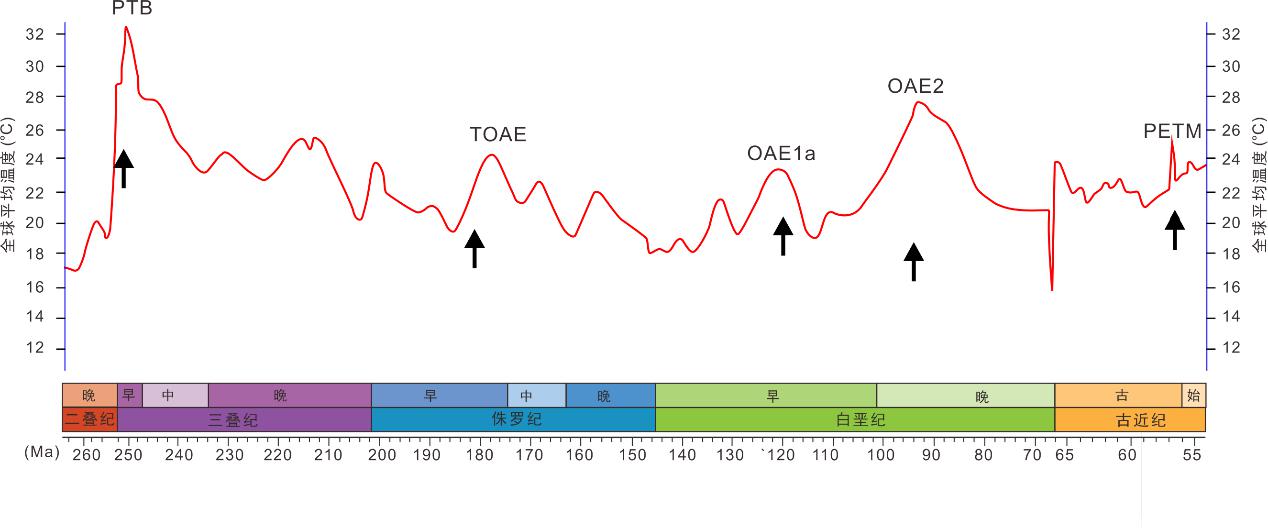 图1 中、新生代全球平均温度曲线图,显示典型极热事件PTB、TOAE、OAEs及PETM(修改自Scotese et al., 2021)
